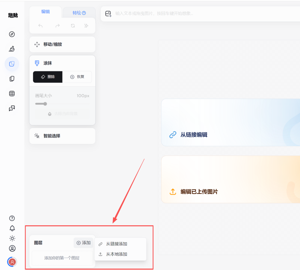 「外部图像编辑」功能允许您「从图片地址导入」或「本地上传图片」,并进行一系列高级编辑操作,如扩展、裁剪、重绘、添加或修改图像中的元素,让您的创意得以充分展现。